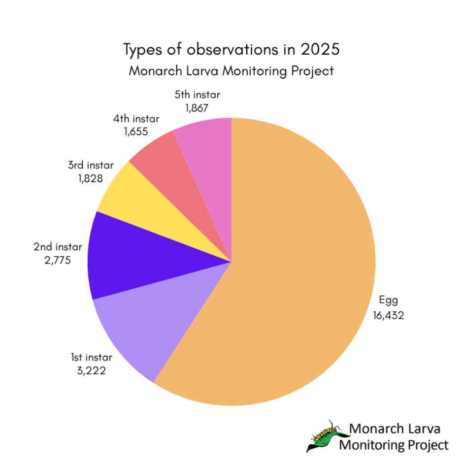 During those nearly 3,000 times of monitoring, you found a lot of monarchs on those 237,049 plants. Here are the 2025 numbers, divided by monarch stage. The majority of observations were of eggs (59.2%), followed by first instars (11.6%), then second instars (10%). Fifth instars were the third-most common (6.7%), followed by third instar (6.6%), and finally, fourth instar (6%).